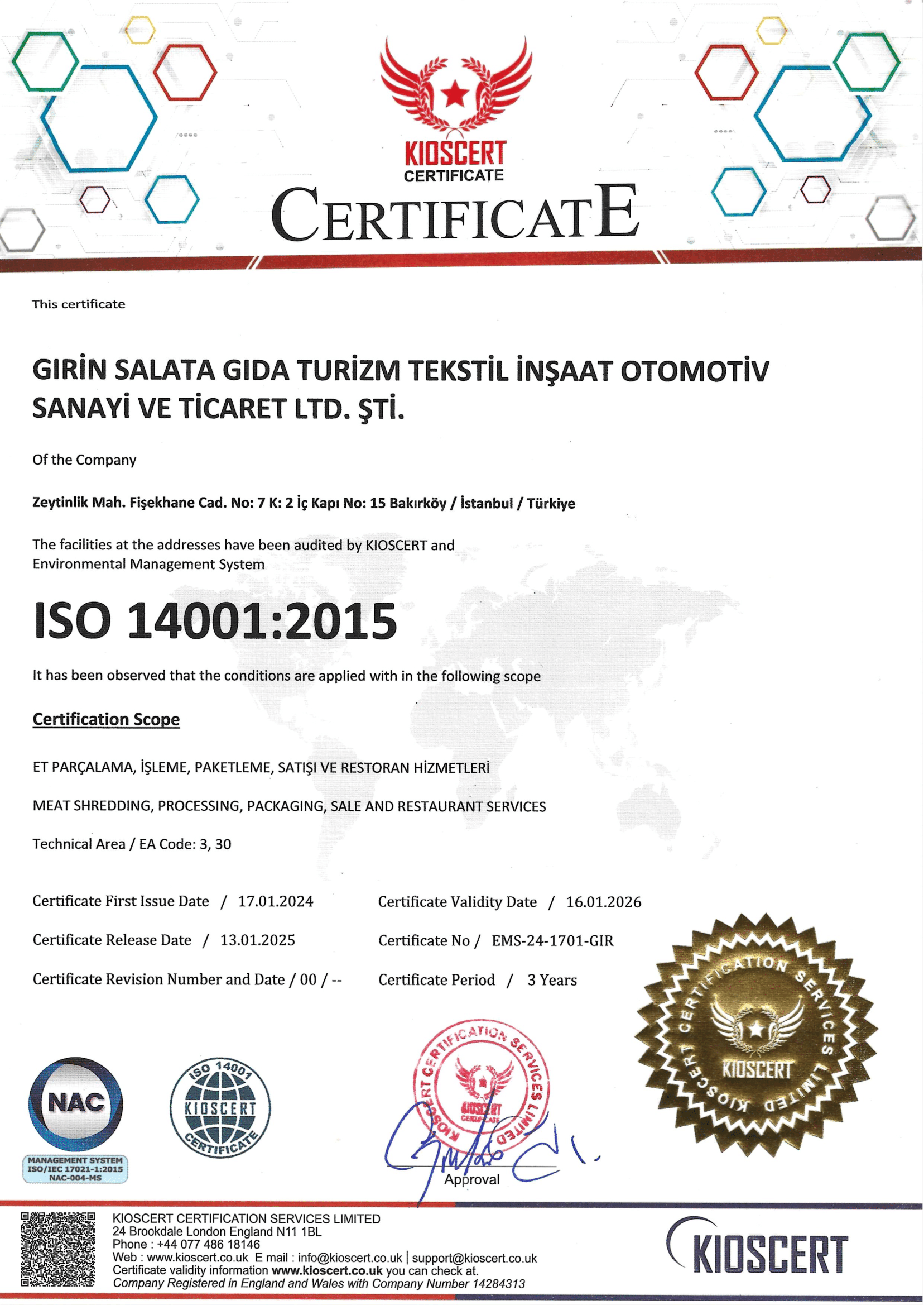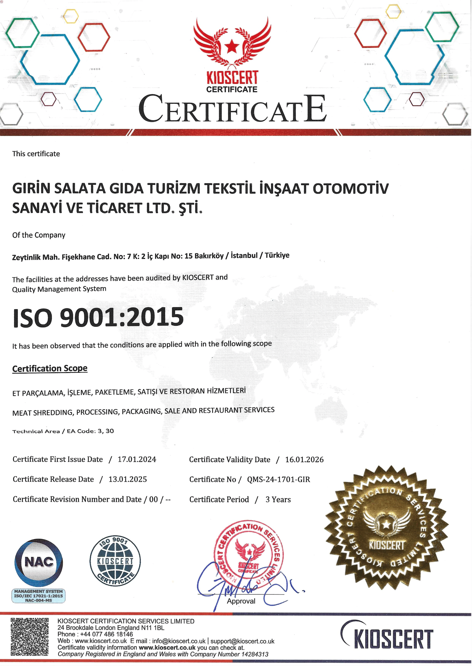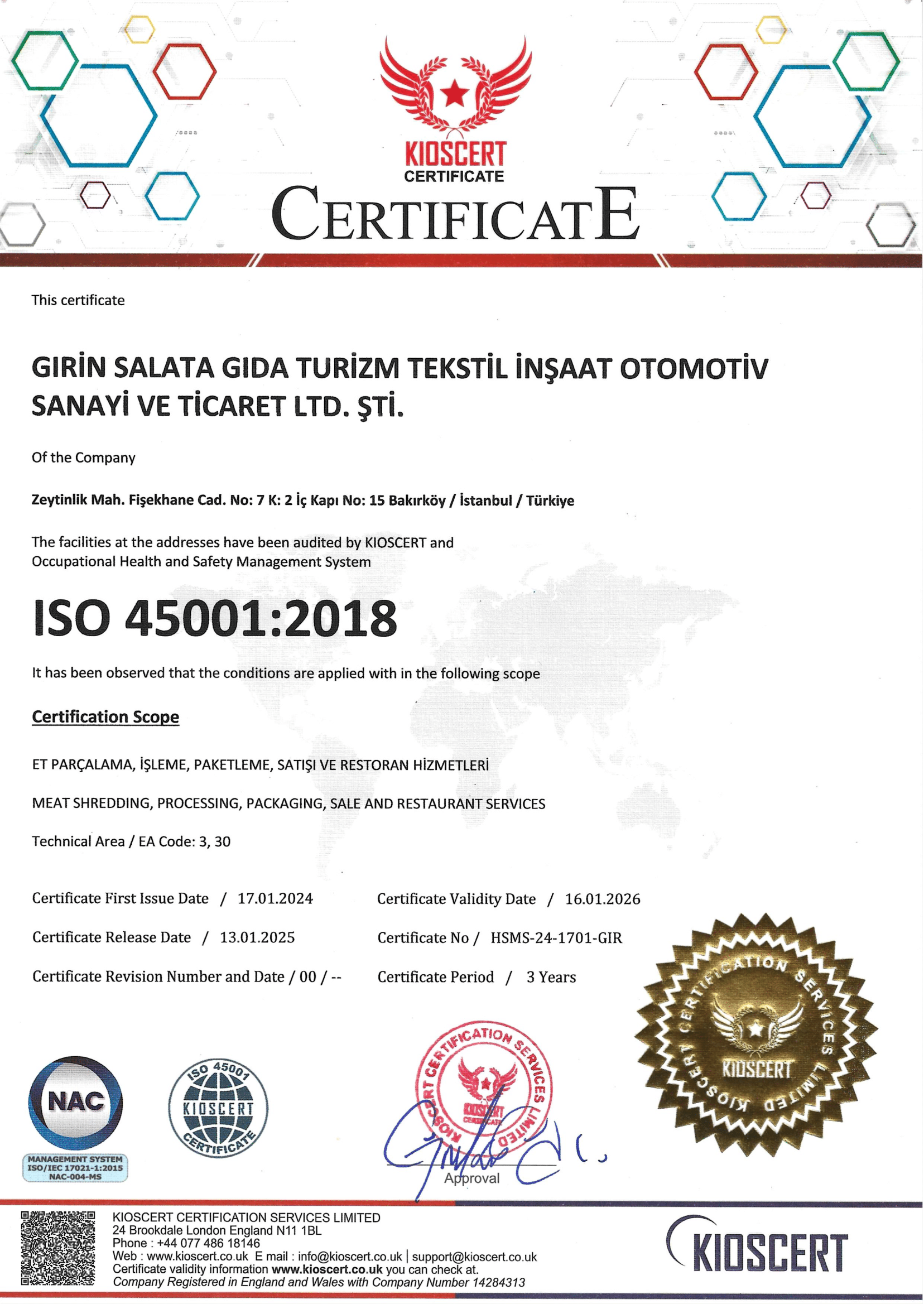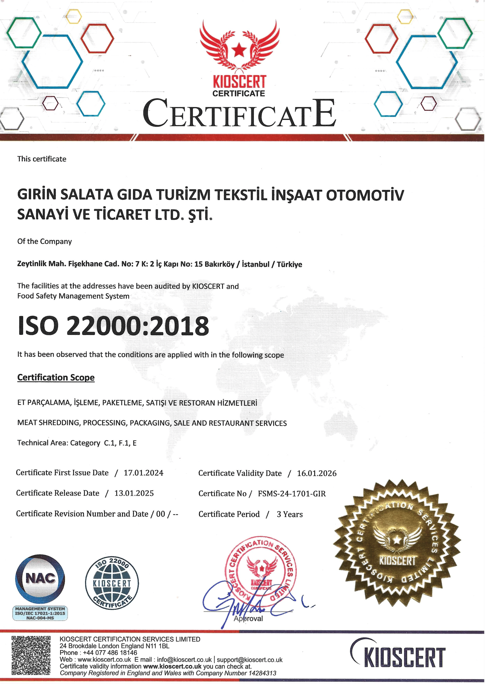 Gıda güvenliği, tazelik ve üretim standartlarımız; ulusal ve uluslararası sertifikalarla belgelenmiştir. Her tabakta, doğrulanmış bir özen var.